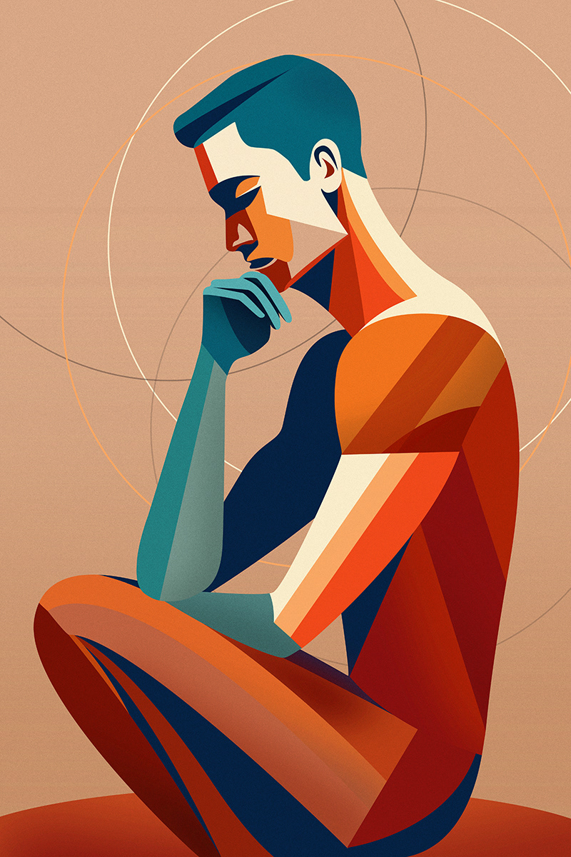 La figura maschile si raccoglie nel gesto del pensiero.