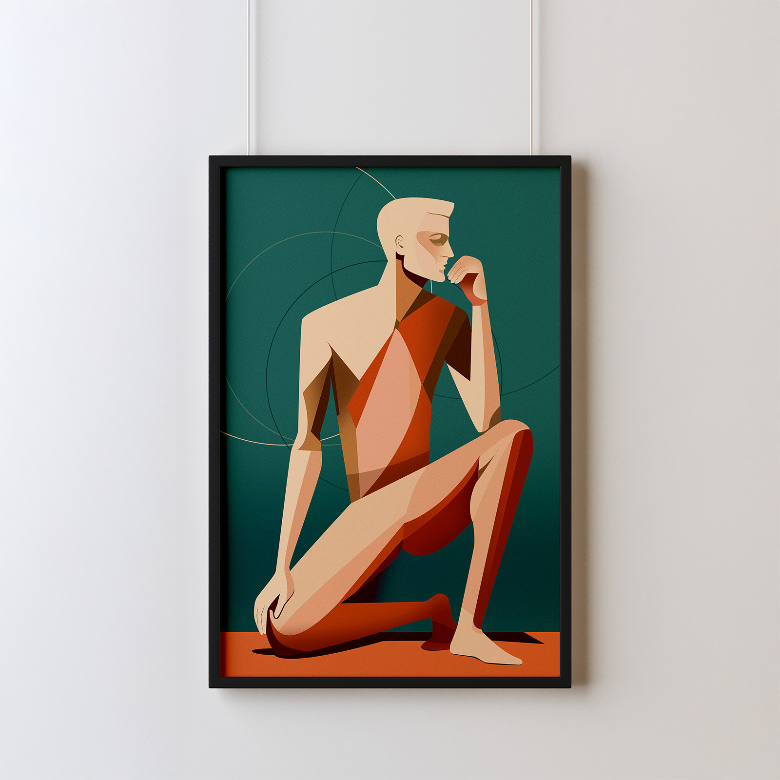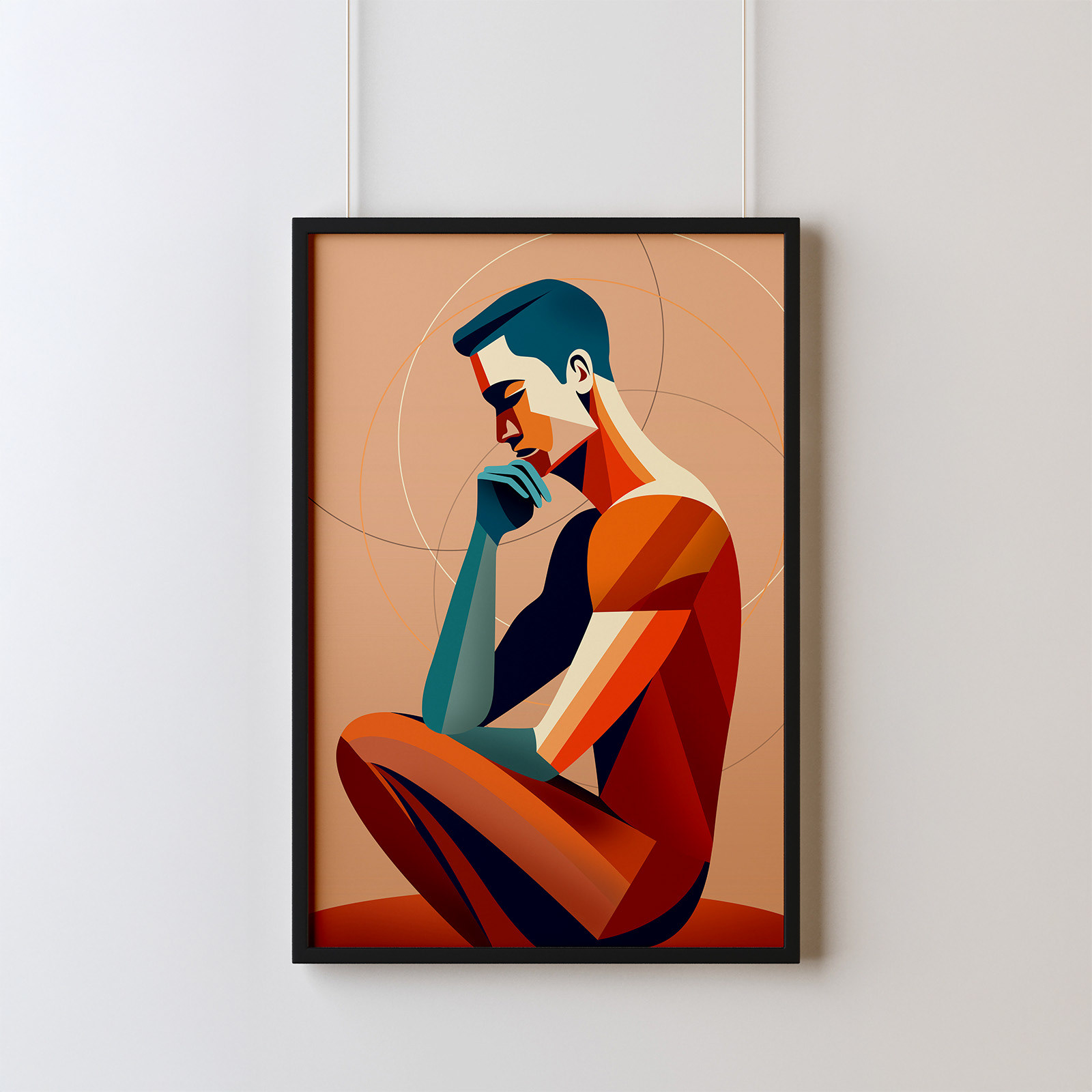 The male figure is concentrated in the gesture of thought.